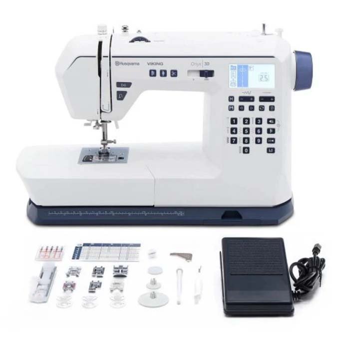Die Nähmaschine Husqvarna Onyx 30 ist eine moderne elektronische Nähmaschine mit LCD-Display, 150 Nähstichen, 2 Alphabeten, 9 Arten von automatischen Knopflöchern, einem großen Nähbereich, manueller Fußdruckeinstellung, automatischem Fadenabschneider und einem Nadeleinfädler.